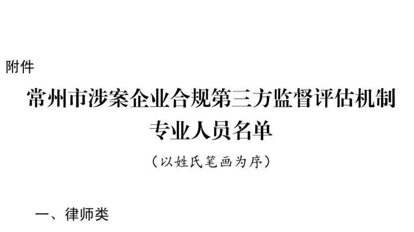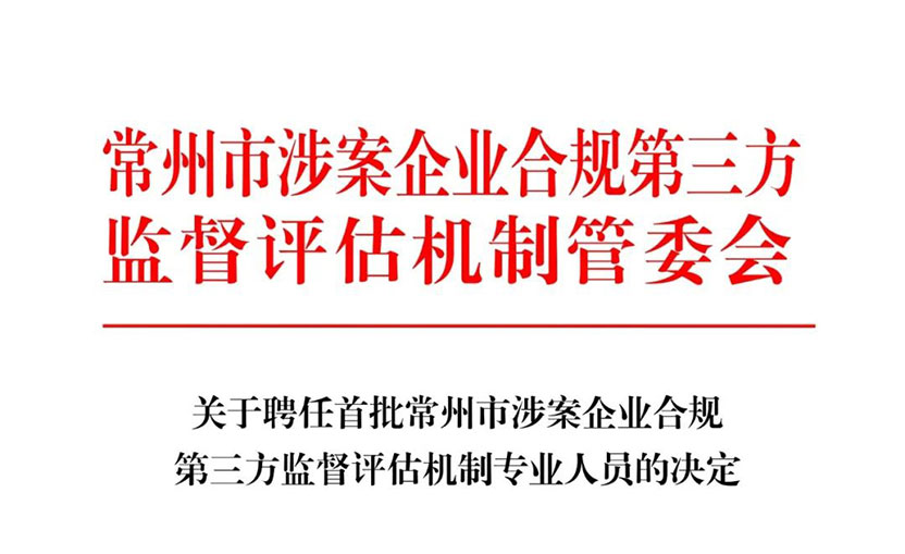 近日,我所曹波律师有幸被常州市涉案企业合规第三方监督评估机制管理委员会聘请为首批第三方监督评估机制专业人员,聘期至2025 年7月。