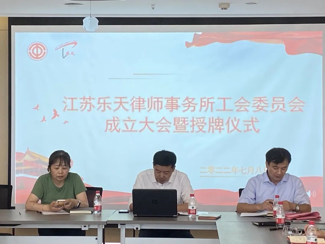 随后,常州市律师行业工会联合会主席、常州市律师协会秘书长曹荣,常州市总工会基层工作部副部长王一博正式向江苏乐天律师事务所工会委员会授牌。