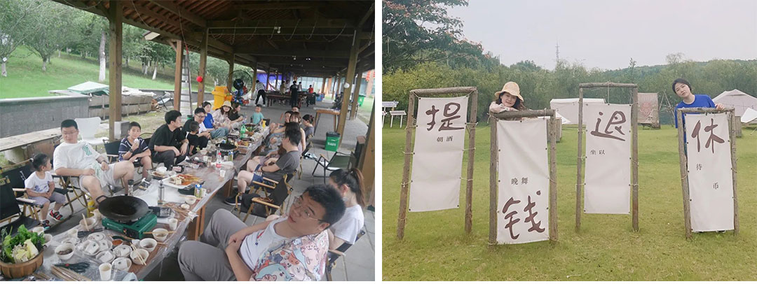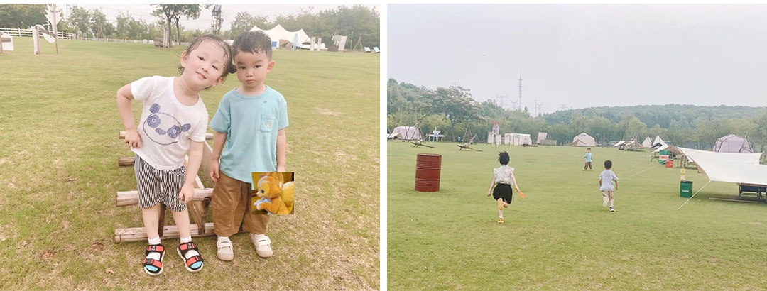 新龙生态园的东区有一条细长的河,流淌在阳光下,远远看去,像一条发光的蓝色玛瑙项链。河岸,就是本次团建的部鲁营地,乐天所的小伙伴们携家带口,陆续就位。